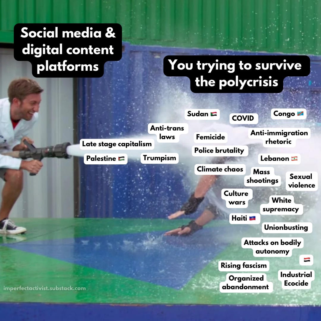 No one would ever suggest that the violence of bearing witness is greater than the violence on the ground. We must continually maintain perspective on the relative privilege of watching many of the events of the polycrisis unfold from a distance. However, there is a perverse psychological terror being enacted on those of us witnessing from afar. Many of us have experienced this terror in full technicolor over the last year: the images of bodies without heads, heads without bodies, body parts in bags measured out by weight, the imprint of tank treads on a body that has a leg in a cast, the people being pulled from wreckage, and the screams. So. Many. Screams.